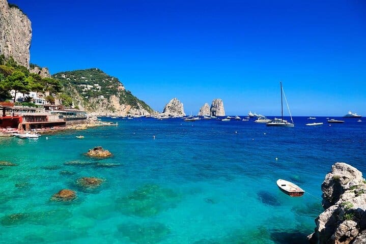 You will see the limestone caves, like the Marvellous Grotto, the White Grotto and the Green Grotto. You will sail along Villa Curzio Malaparte and you will pass through the famous Arch of Love of the Faraglioni, symbol of the island. Stop in the bay of Marina Piccola for a swim.